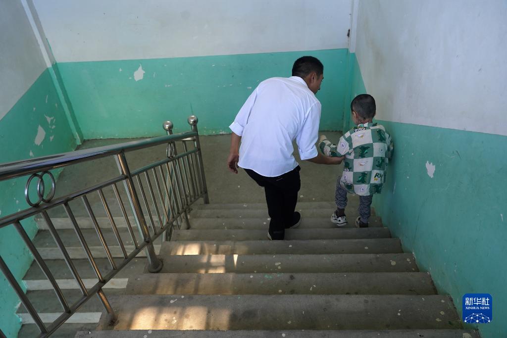 在江西省高安市華林山鎮中心小學朱家教學點,李新江(左)牽著小澤下樓(9月4日攝)。