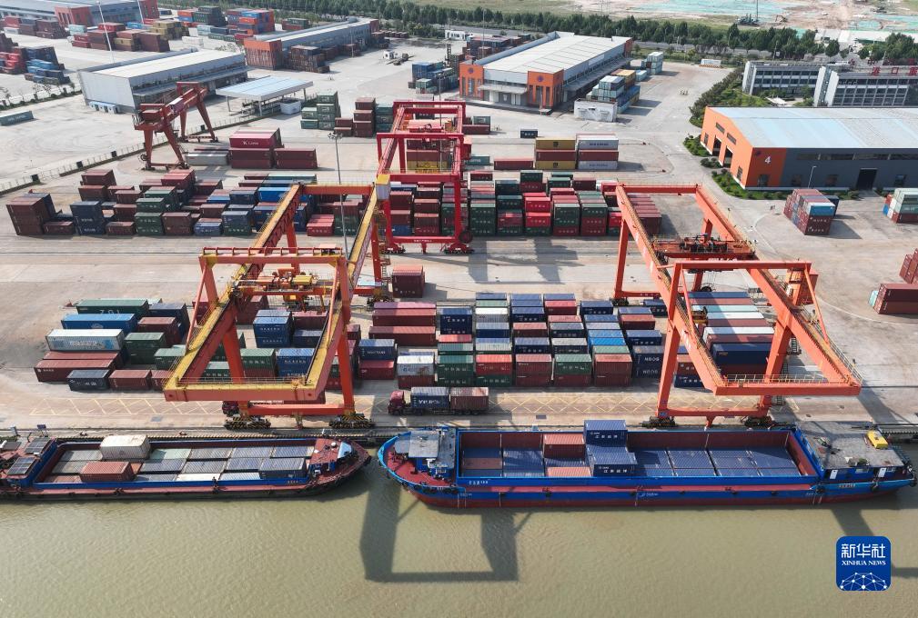 9月10日,在運河宿遷港集裝箱碼頭,大型機械在吊裝集裝箱(無人機照片)。