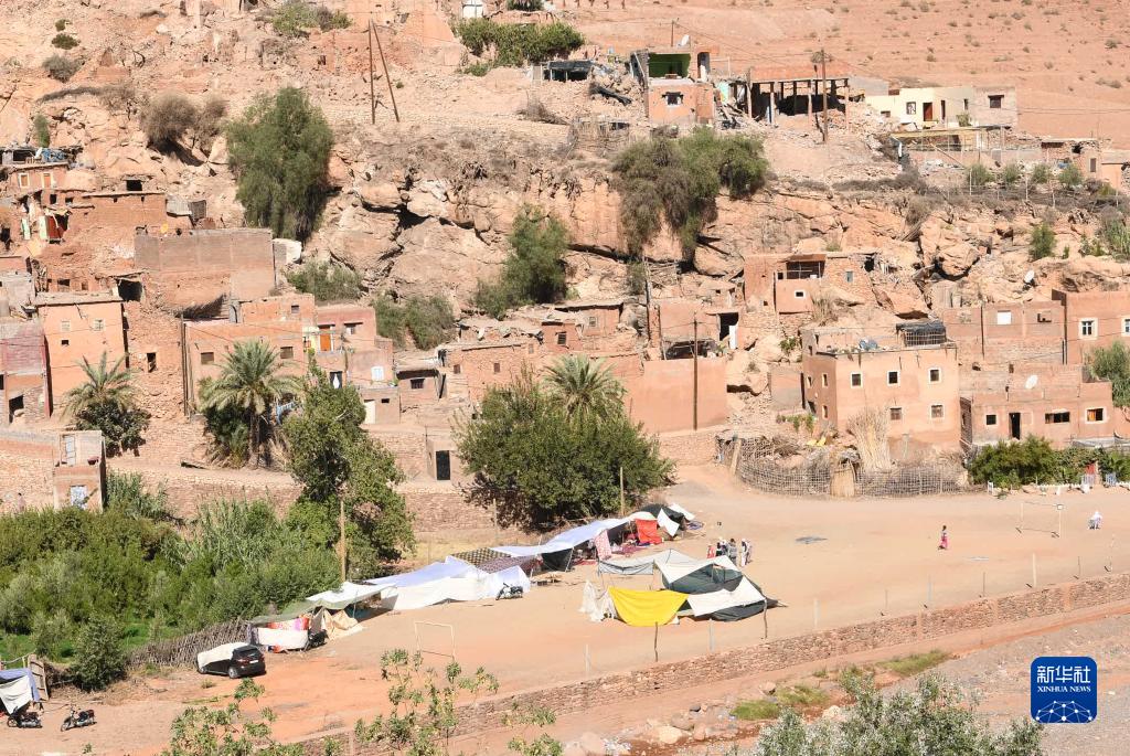 這是9月10日在摩洛哥震中附近的艾茲魯村拍攝的一處臨時(shí)安置點(diǎn)。