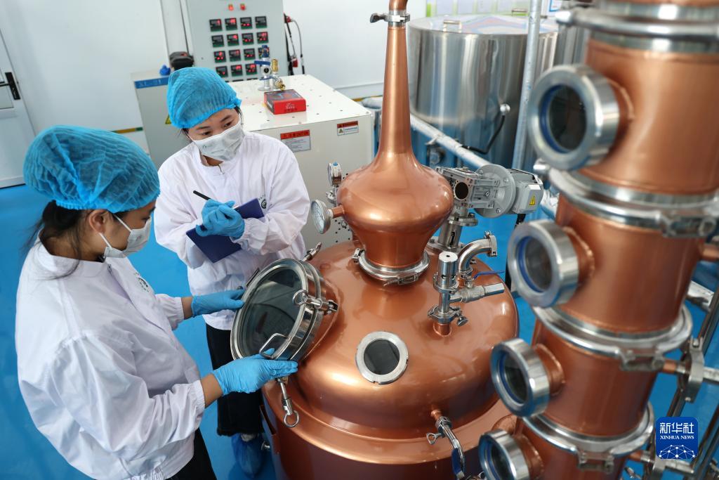 9月9日,在山東省樂陵市一家健康食品研發企業車間,工作人員通過蒸餾裝置進行酒精蒸餾。