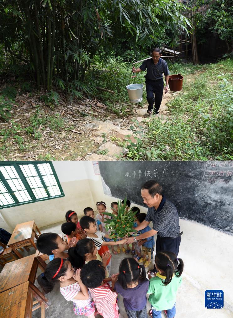 拼版照片:廣西天等縣進結鎮愛樂村龍坡屯龍坡教學點的黃明料老師到附近農家挑水回學校(上圖),黃明料老師接受學生教師節祝福(下圖)(2015年9月10日攝)。當時,黃明料老師是這個教學點唯一的老師,工作日每天騎著摩托車穿越10公里山路到教學點給孩子們上課。學校沒有自來水,日常用水都是他到附近村民家里挑來。