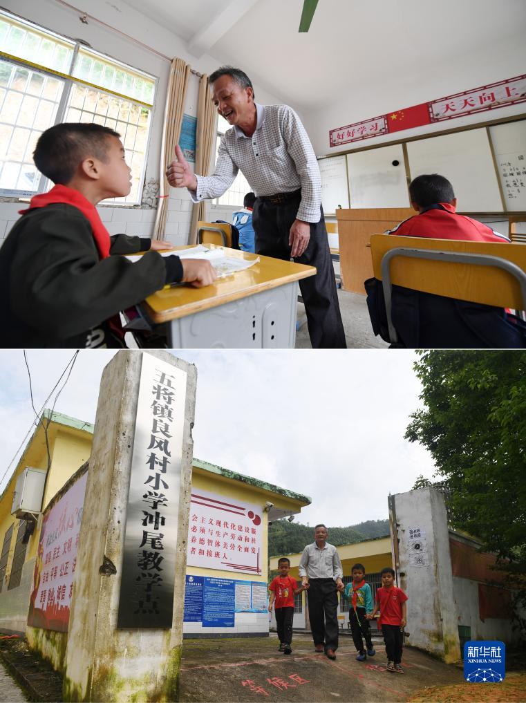 拼版照片:廣西賀州市昭平縣五將鎮良風村小學沖尾教學點的龔壽新老師在課堂上表揚學生(上圖),龔壽新老師領著學生走出校門(下圖)(2022年5月25日攝)。龔壽新從1981年走上講臺至退休,42年時間一直堅守這所教學點,曾獲得“賀州市優秀共產黨員”榮譽稱號。