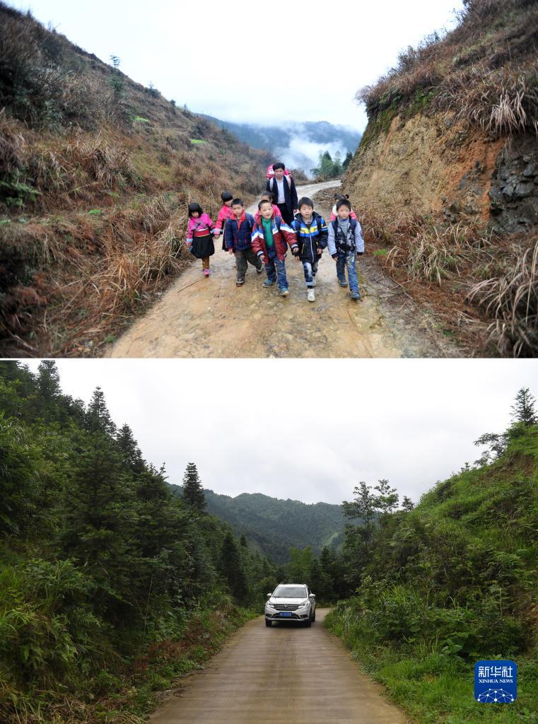 拼版照片:廣西龍勝各族自治縣龍脊鎮江柳村翁江小學的余啟貴老師背著背簍領著學生一起去學校(上圖,2013年2月26日攝);余啟貴老師開著汽車帶著學生去學校(下圖,2020年7月7日攝)。余啟貴是翁江小學唯一的老師,在很長一段時間里,翁江小學沒通公路,上學路上,他每天都背著裝滿書包或一個學生的背簍,領著學生徒步去學校,因此被稱為“背簍老師”。2014年余啟貴榮獲“全國模范教師”稱號。2016年,翁江小學修通水泥路,余啟貴買了小汽車,開車帶學生一起去學校,“背簍老師”變成“汽車老師”。