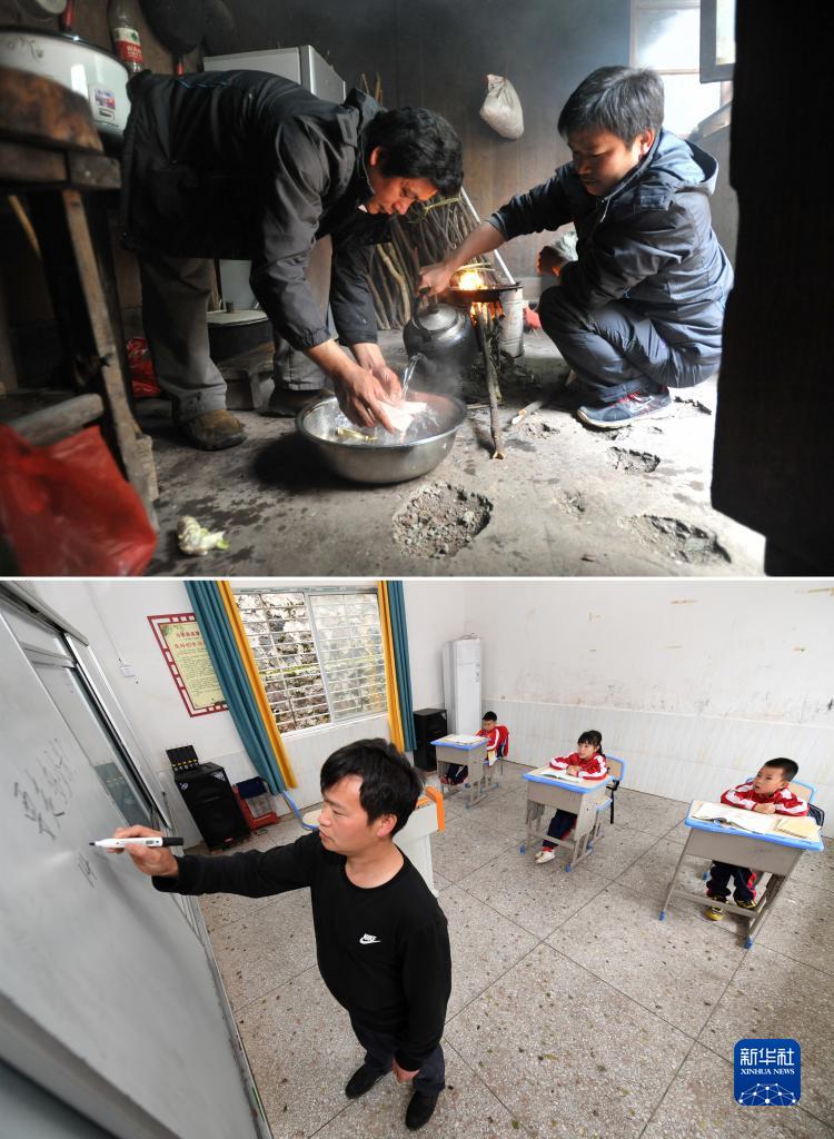 拼版照片:廣西靈川縣海洋鄉(xiāng)中心岐教學(xué)點(diǎn)的蔡教宏老師(右)和同事洗肉給學(xué)生做午餐(上圖,2013年3月27日攝),蔡教宏老師給學(xué)生上課(下圖,2023年5月17日攝)。蔡教宏是廣西靈川縣海洋鄉(xiāng)中心岐教學(xué)點(diǎn)唯一的教師,1978年出生,在這所教學(xué)點(diǎn)教書(shū)已經(jīng)22個(gè)年頭。