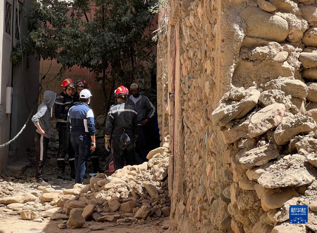 9月10日,救援人員在摩洛哥震中附近的艾米茲米茲村參與搜救工作。