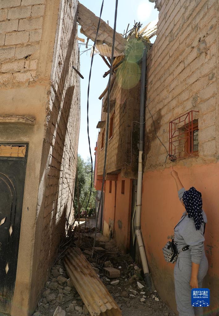 9月10日,在摩洛哥震中附近的艾米茲米茲村,一名女子查看受損房屋。