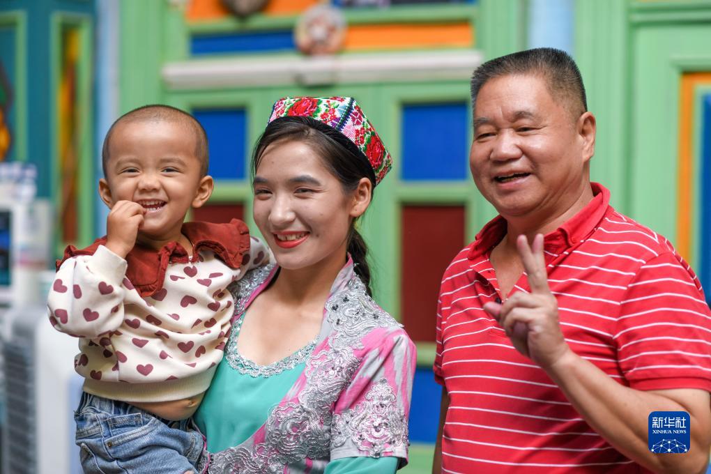 在新疆喀什古城景區“古麗的家”旅游家訪點,游客在與演員合影留念(9月7日攝)。