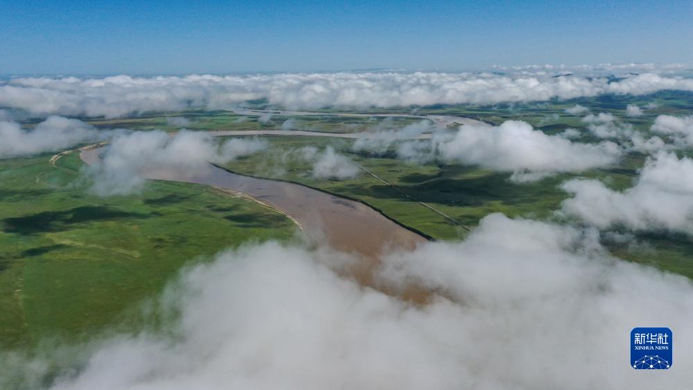 這是8月22日清晨在四川省阿壩藏族羌族自治州若爾蓋縣唐克鎮拍攝的黃河九曲第一灣景色(無人機照片)。