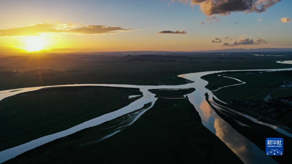 這是8月21日在四川省阿壩藏族羌族自治州若爾蓋縣唐克鎮拍攝的黃河九曲第一灣落日(無人機照片)。