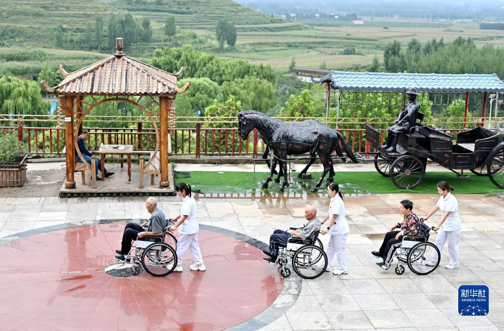 9月11日,在河北省灤州市王店子鎮海洋養老中心,醫務人員帶領老人們在庭院中散心。