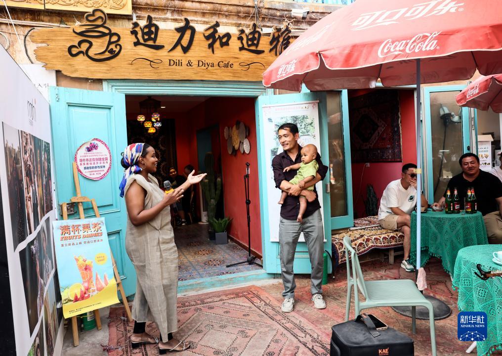 海迪雅(左)在自家咖啡館前唱歌,并與丈夫迪力夏提和孩子深情互望(9月7日攝)。