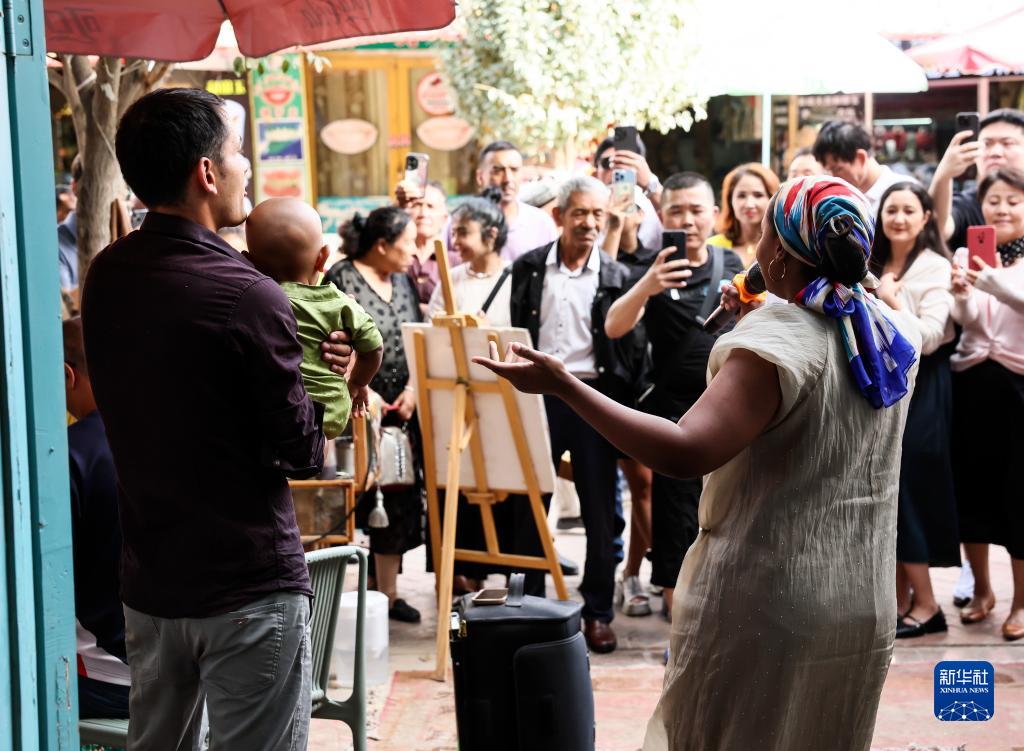 海迪雅(前右)在自家咖啡館前唱歌,丈夫迪力夏提抱著孩子與她互動(9月7日攝)。