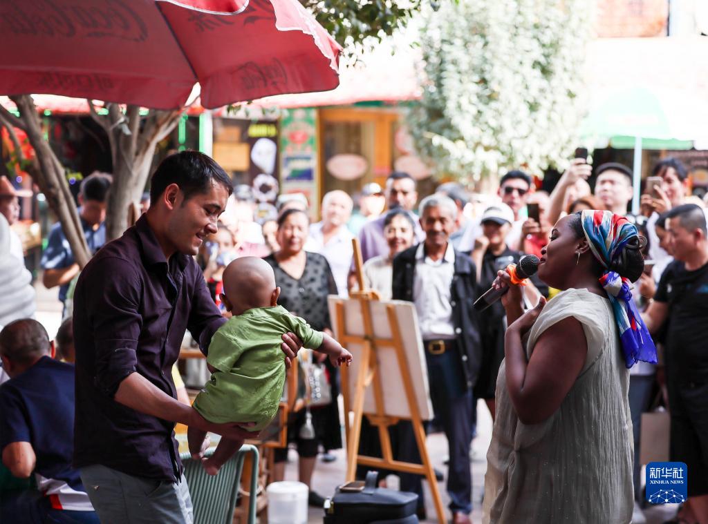 海迪雅(前右)在自家咖啡館前唱歌,丈夫迪力夏提抱著孩子與她互動(9月7日攝)。