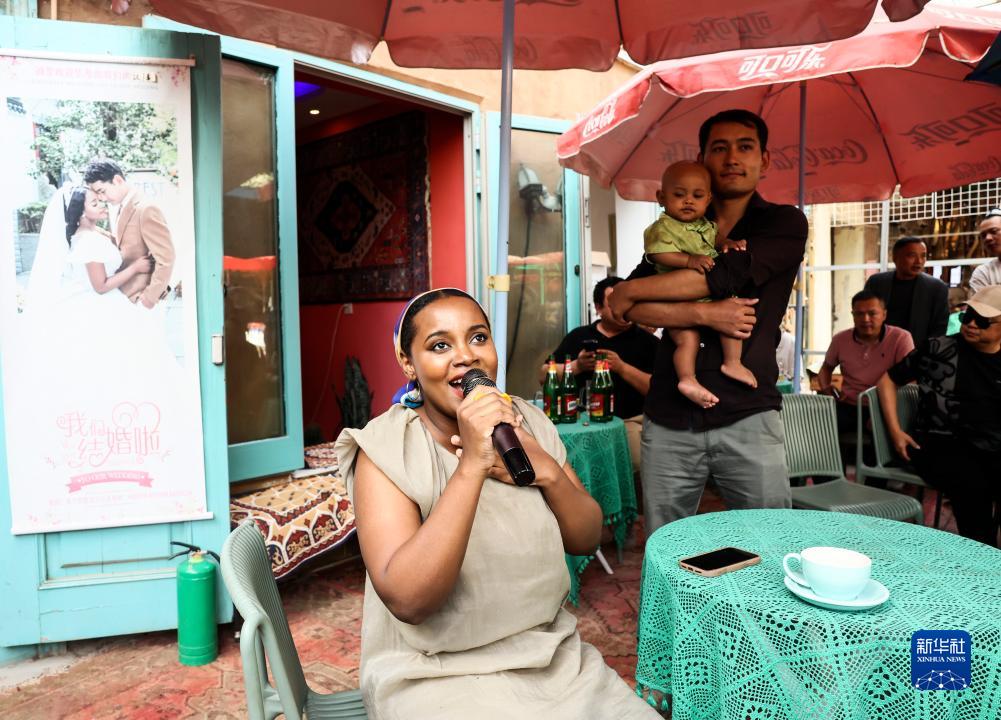 海迪雅在自家咖啡館前唱歌,丈夫迪力夏提抱著孩子站在其身側(cè)(9月7日攝)。