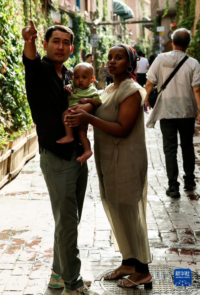 迪力夏提抱著孩子和海迪雅走在喀什古城景區的巷道內(9月7日攝)。