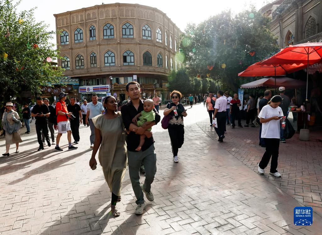 迪力夏提(前右)抱著孩子和海迪雅走在喀什古城景區的巷道內(9月7日攝)。