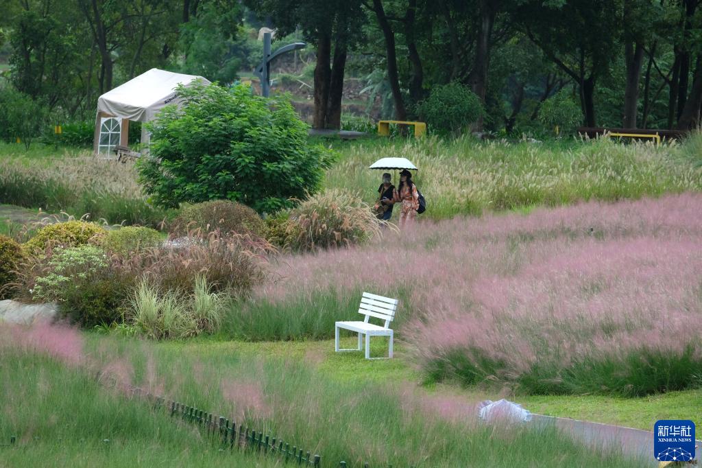 9月11日,游客在廣西南寧市園博園觀賞粉黛亂子草。