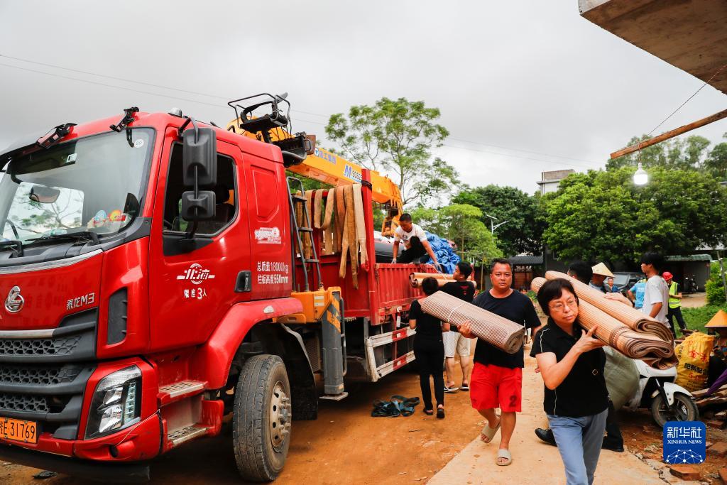 9月11日,在廣西北海市合浦縣白沙鎮虎嶺村,群眾和政府工作人員將被褥、竹席等物資搬入安置點。