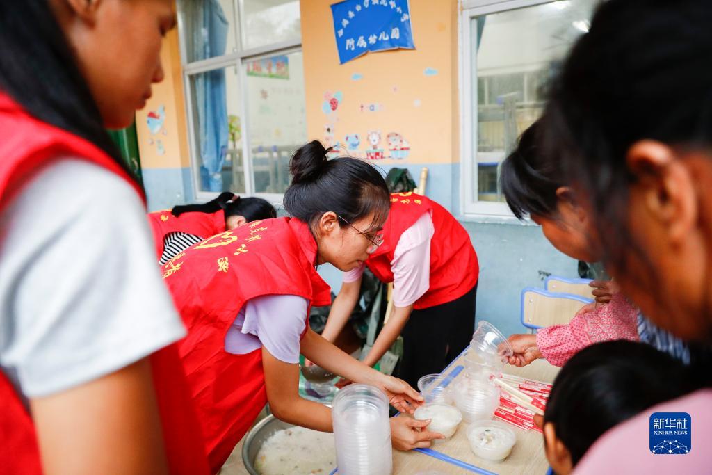 9月11日,在廣西北海市合浦縣白沙鎮虎嶺村,志愿者為安置點的群眾分發晚餐。