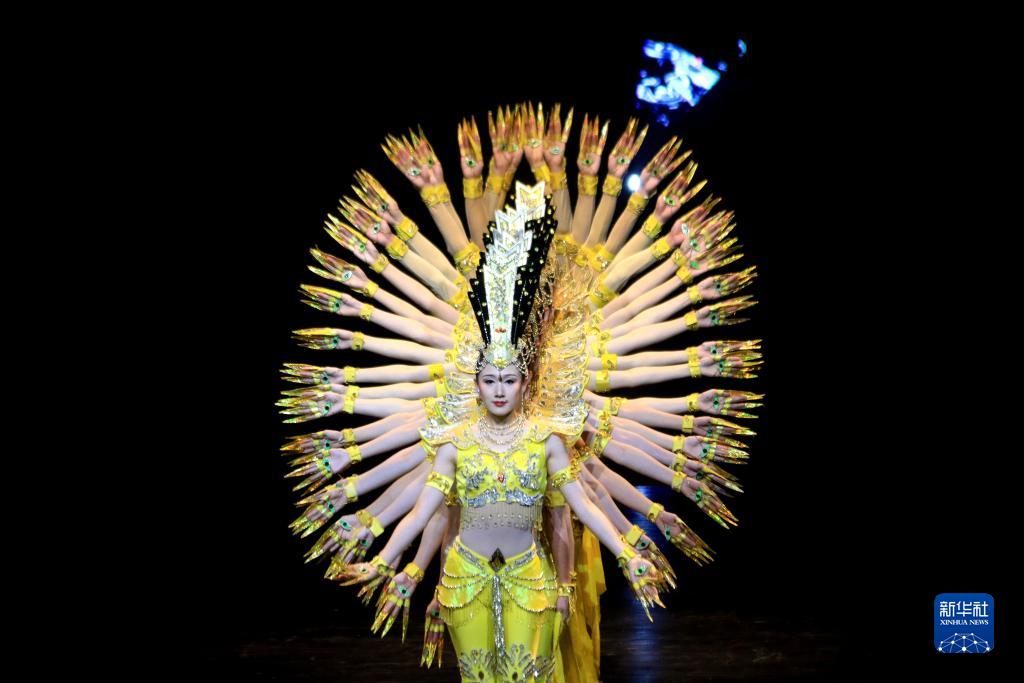 9月10日晚,在甘肅敦煌大劇院,演員在大型情景音畫劇《千手千眼》中表演。