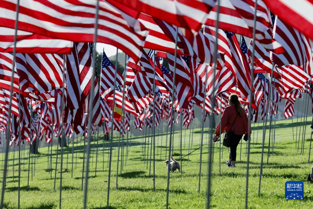 9月10日,一名女子走在美國加利福尼亞州馬利布佩珀代恩大學草坪上的“旗海”中。