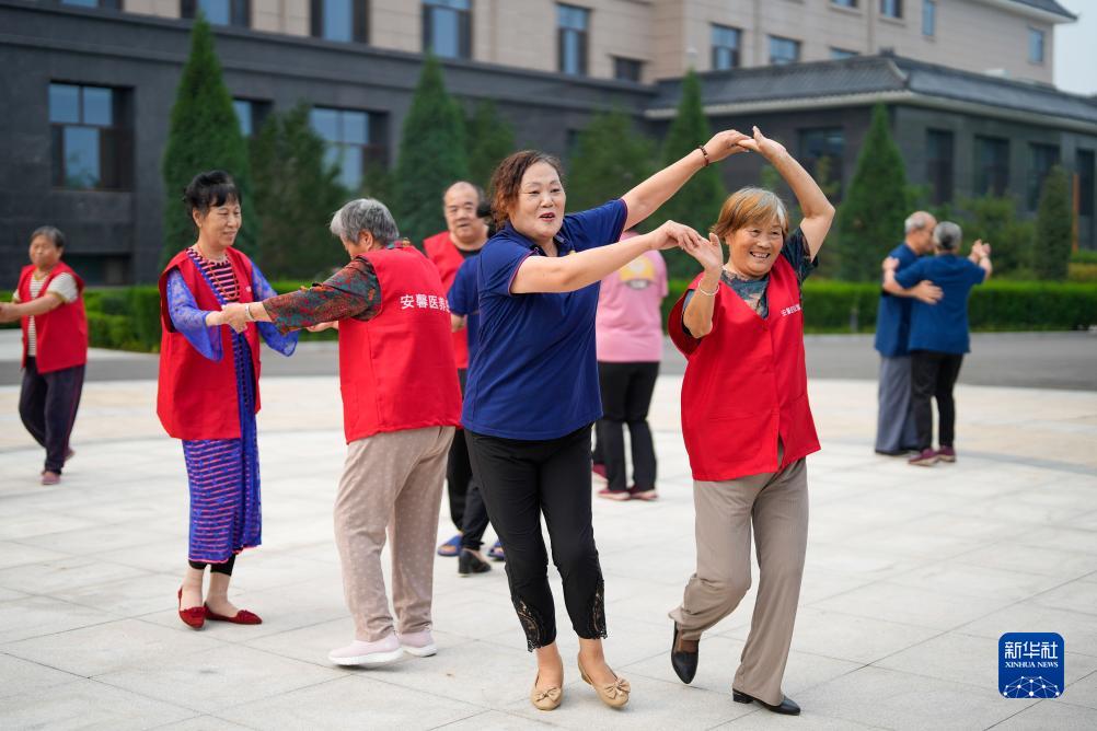 9月12日,河北省唐山市古冶區(qū)一家養(yǎng)老機(jī)構(gòu)的老人們?cè)谠鹤永镞\(yùn)動(dòng)。