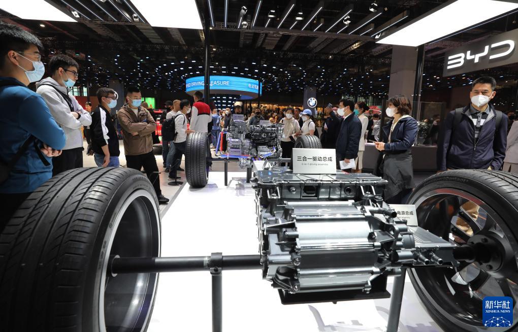 參觀者在第二十屆上海車展比亞迪汽車展臺(tái)展出的DM-P插混動(dòng)力單元模型展品前駐足觀看(2023年4月24日攝)。