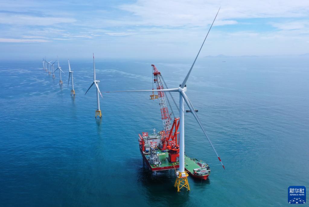全球首臺16兆瓦大容量海上風電機組在福建北部海域安裝完成(2023年6月28日攝,無人機照片)。