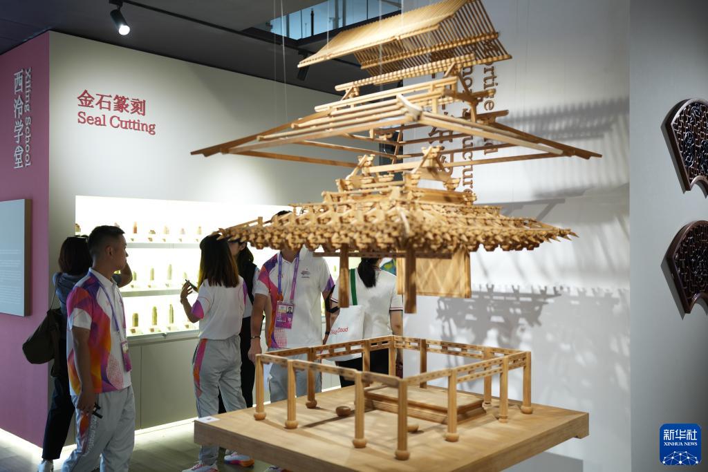 9月12日,媒體記者參觀亞運村內(nèi)展示的金石篆刻和榫卯結構展品。