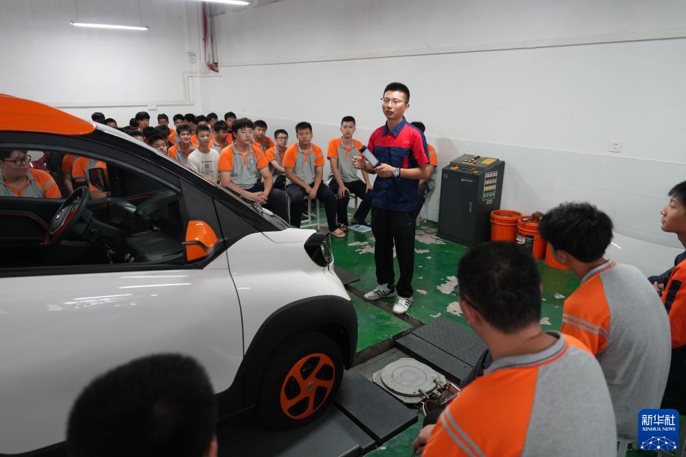 9月12日,在重慶市北碚區職業教育中心新能源汽修實訓室,教師在給學生講解新能源汽車維修知識。