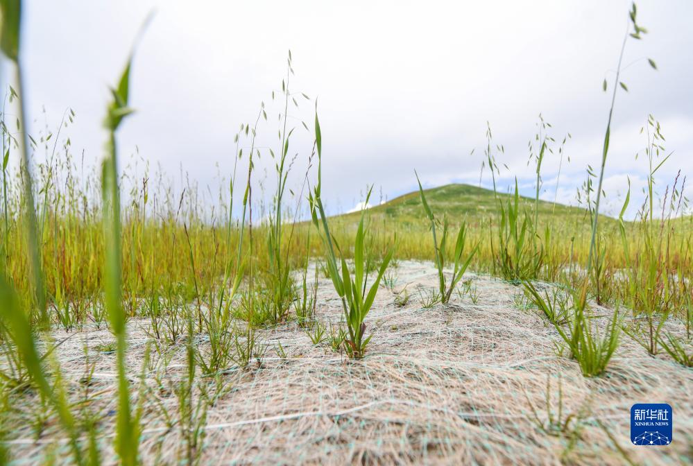 若爾蓋縣唐克鎮(zhèn)嘎爾瑪村的草原生態(tài)修復(fù)項(xiàng)目已完成近三個(gè)月。披堿草、老芒麥、高冰草和黑麥草等從椰絲毯織成的小方格中破土而出,最高已近半米,成為攻克生態(tài)修復(fù)難點(diǎn)、治愈草原“傷疤”的希望。