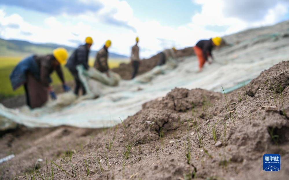 在若爾蓋縣達(dá)扎寺鎮(zhèn)多瑪村廢棄礦山治理點(diǎn),工人在邊坡上鋪椰絲毯(8月23日攝)。