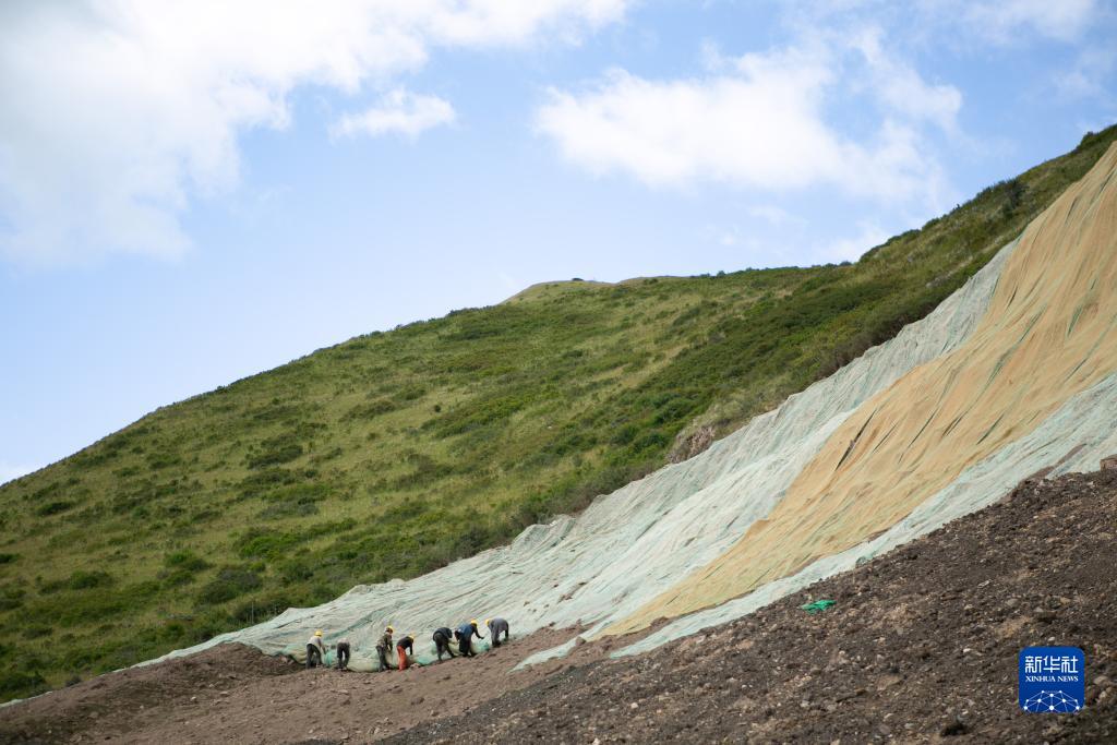 在若爾蓋縣達扎寺鎮(zhèn)多瑪村廢棄礦山治理點,工人在邊坡上鋪椰絲毯(8月23日攝)。