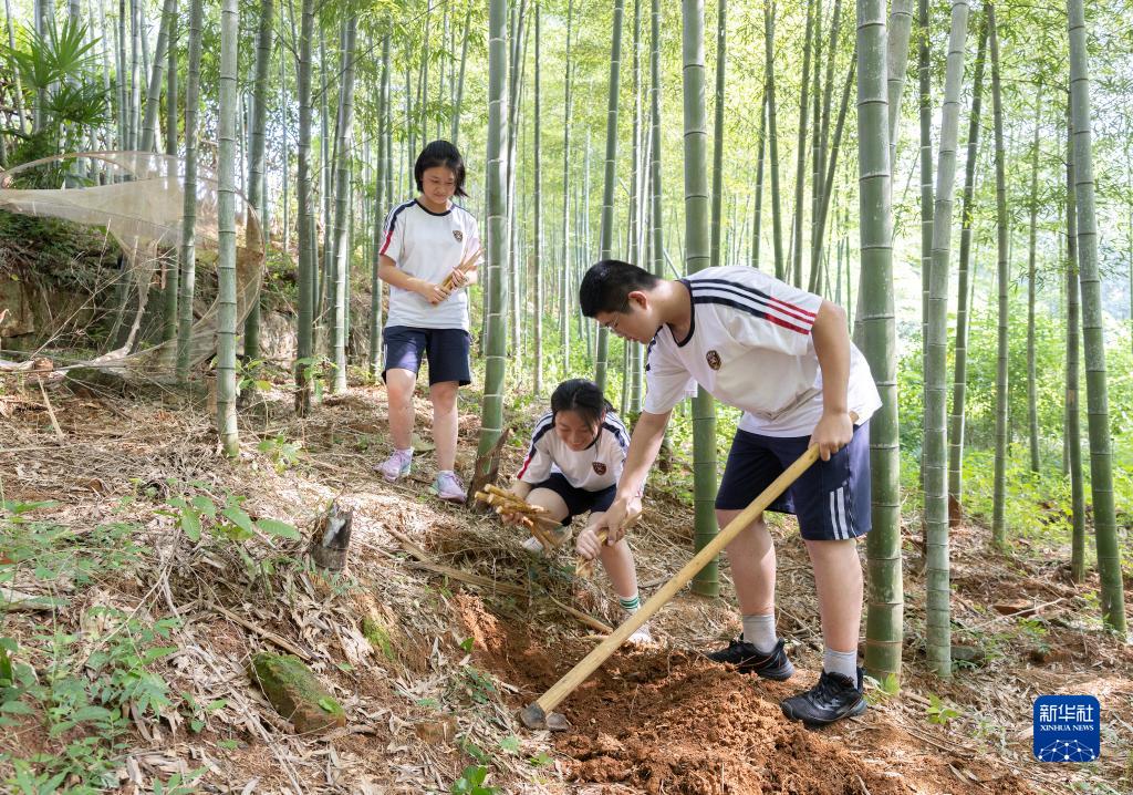 9月12日,浙江省諸暨市學勉中學的學生在竹園挖筍。