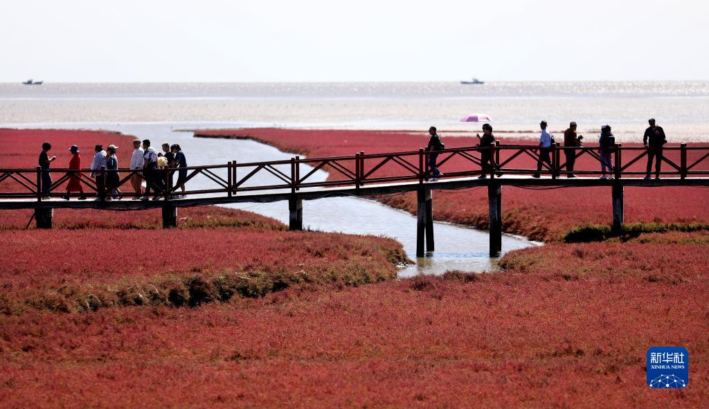 近日,遼寧省盤錦紅海灘國家風景廊道內(nèi)的堿蓬草迎來最佳觀賞期,吸引了眾多游客前來觀賞游玩。