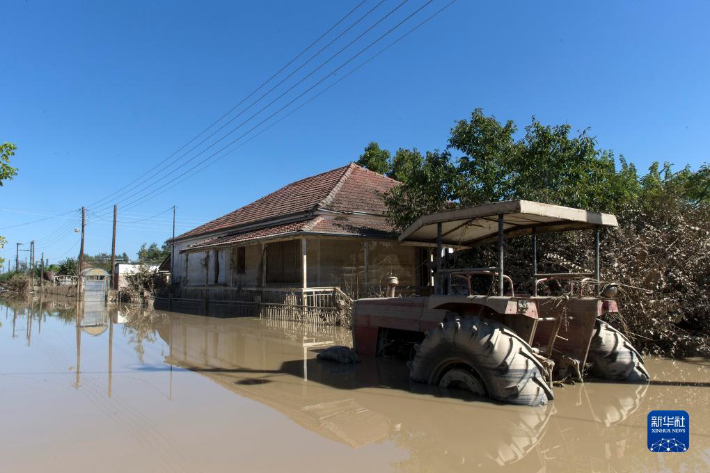 9月12日,希臘中部卡爾季察地區的一處村莊道路淹沒在水中。