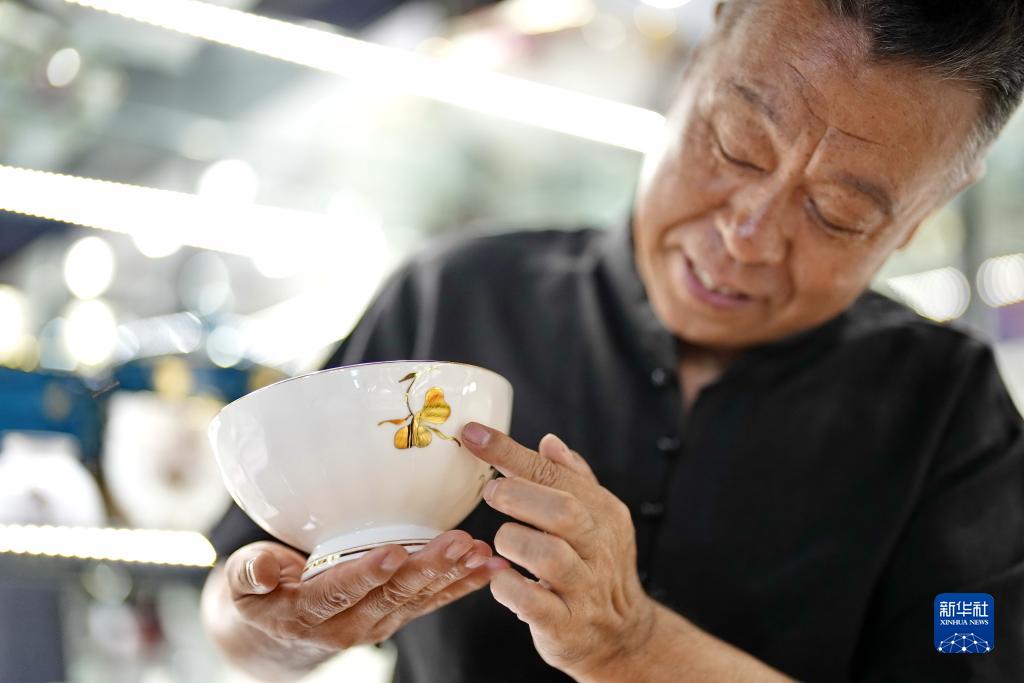 河北省唐山市素有“北方瓷都”的美譽,陶瓷雕金技藝作為陶瓷裝飾技法之一,在當地歷史悠久。唐山市路北區居民戴佩維17歲時進入陶瓷廠學習雕金技藝,經過45年的潛心研究,將傳統技藝與美術繪畫、印刷技術、現代裝飾風格相結合,在普通細白瓷、骨質瓷等眾多瓷種上實現雕金裝飾的藝術創作,使雕金技法更加豐富多彩。2022年,以戴佩維為代表性傳承人的傳統陶瓷雕金技藝被列入唐山市市級非物質文化遺產代表性項目名錄。