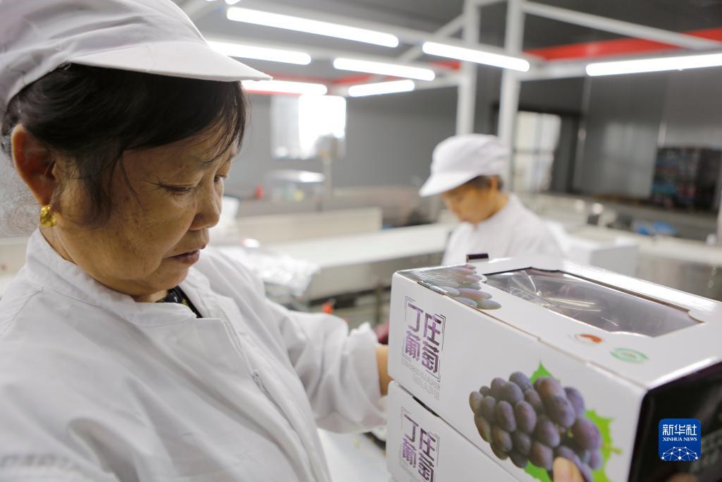 9月12日,句容市丁莊村葡萄合作聯社分揀中心的工作人員在整理裝箱的葡萄。