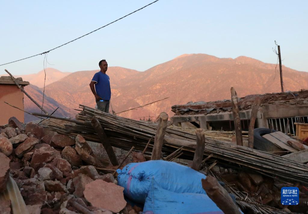 9月12日,在震中區域的摩洛哥豪茲省塔拉特恩雅庫布村,一名男子站在廢墟上。