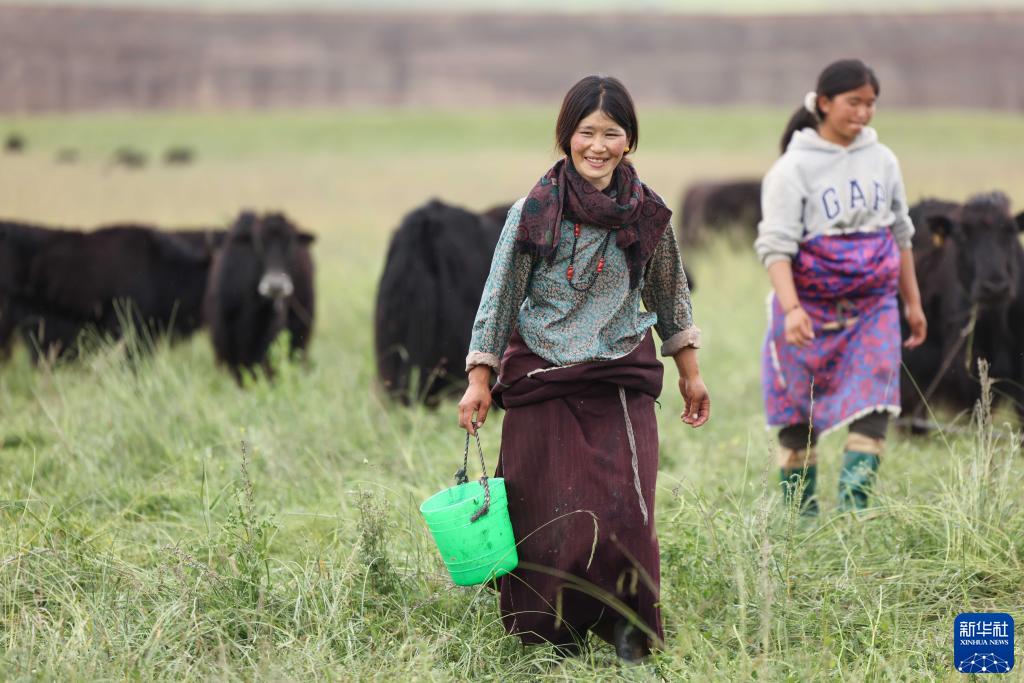 8月17日,在青海省黃南藏族自治州河南蒙古族自治縣多松鄉(xiāng)多松村,扎西曲培的妻子斗格吉(左)準(zhǔn)備去擠牛奶。新華社記者 邢廣利 攝