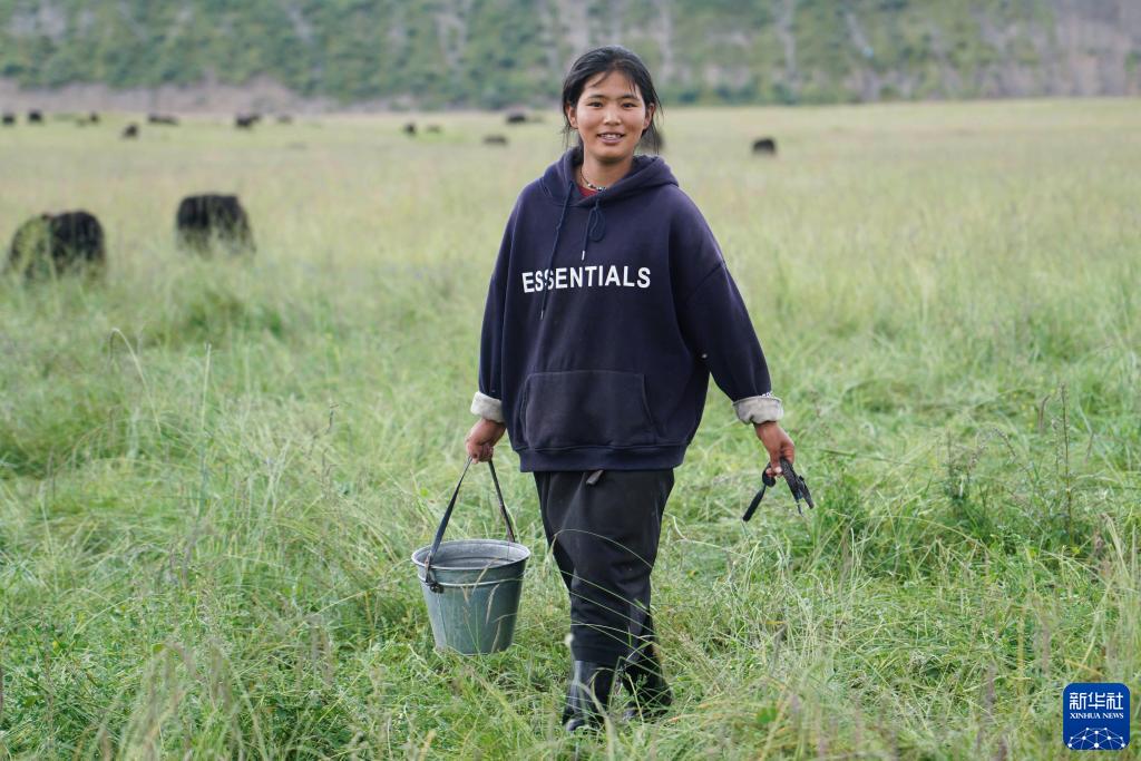 8月17日,在青海省黃南藏族自治州河南蒙古族自治縣多松鄉多松村,扎西曲培的女兒仁青卓瑪準備擠牛奶。新華社記者 王靜頤 攝