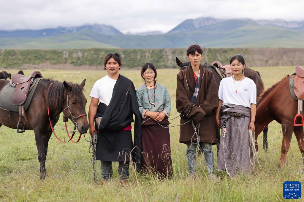 這是8月17日在青海省黃南藏族自治州河南蒙古族自治縣多松鄉多松村拍攝的扎西曲培一家的合影。新華社記者 邢廣利 攝