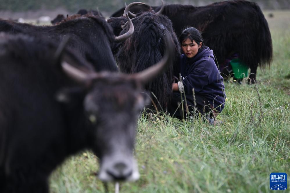 8月17日,在青海省黃南藏族自治州河南蒙古族自治縣多松鄉多松村,扎西曲培的女兒仁青卓瑪在擠牛奶。新華社記者 張龍 攝
