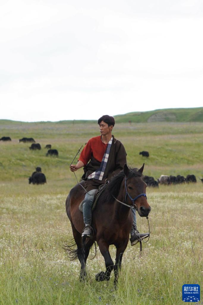 8月17日,在青海省黃南藏族自治州河南蒙古族自治縣多松鄉多松村,扎西曲培的兒子索南尖措在放牧。新華社記者 王靜頤 攝