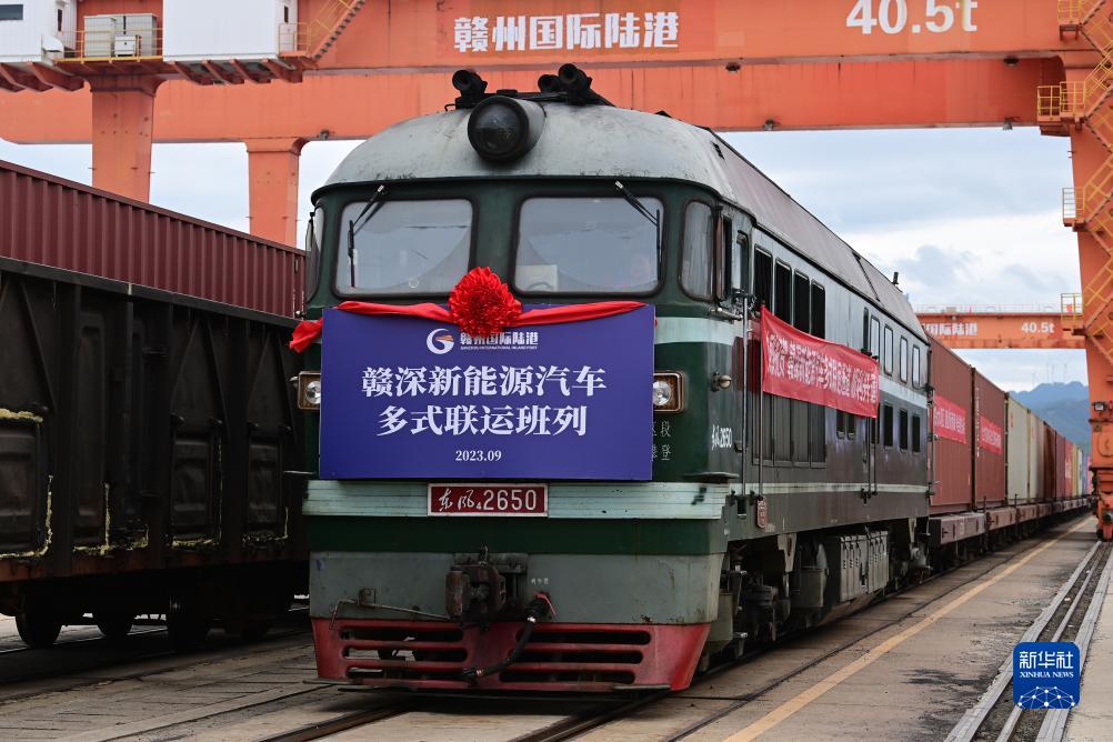 9月13日,在江西贛州國(guó)際陸港,贛深新能源汽車(chē)多式聯(lián)運(yùn)專(zhuān)列準(zhǔn)備啟程開(kāi)往深圳鹽田港。