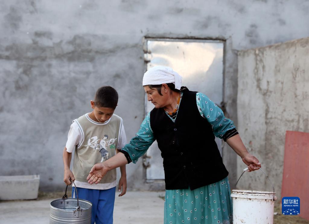 9月5日,巴依卡老人的小兒子熱飛·巴依卡替媽媽拿較重的牛奶桶。新華社記者 程婷婷 攝