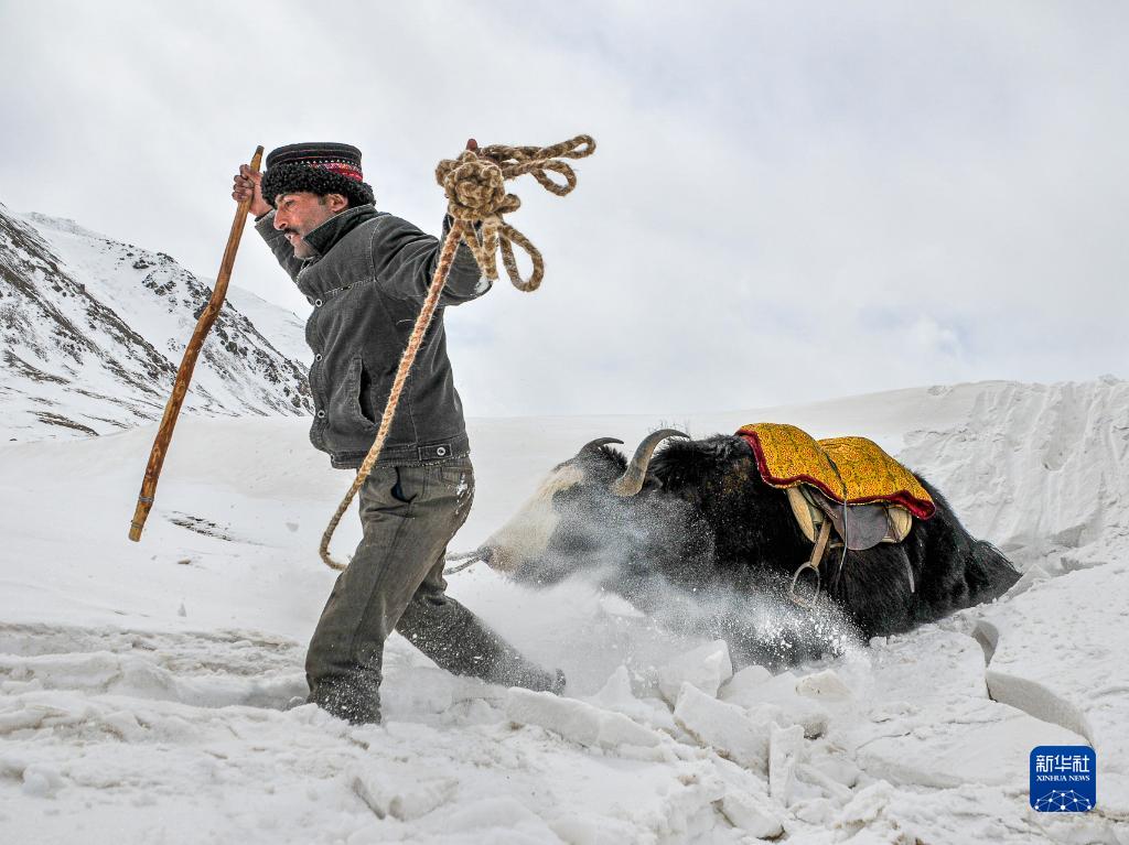 2009年3月6日,拉齊尼牽著牦牛踏著厚厚的積雪在邊境線上巡邏。新華社發(王烈 攝)