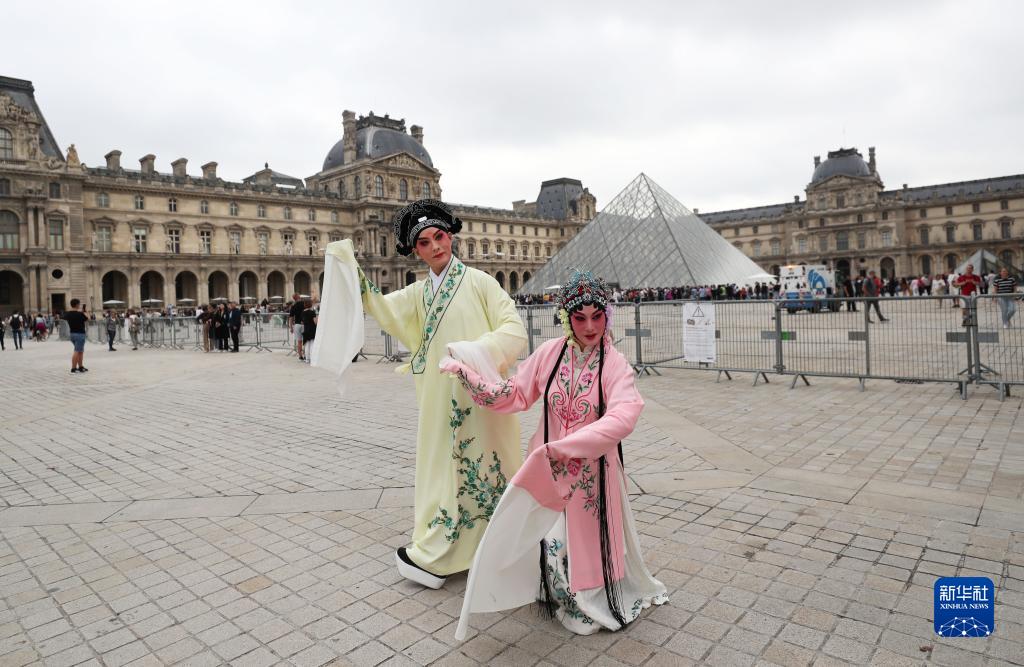 9月13日,江蘇省演藝集團昆劇院院長施夏明(左)和江蘇省演藝集團昆劇院國家一級演員孔愛萍在法國巴黎盧浮宮金字塔廣場上參加昆曲快閃。