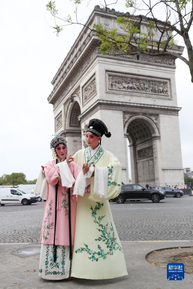 9月13日,江蘇省演藝集團(tuán)昆劇院院長(zhǎng)施夏明(右)和江蘇省演藝集團(tuán)昆劇院國(guó)家一級(jí)演員孔愛萍在法國(guó)巴黎凱旋門附近參加昆曲快閃。