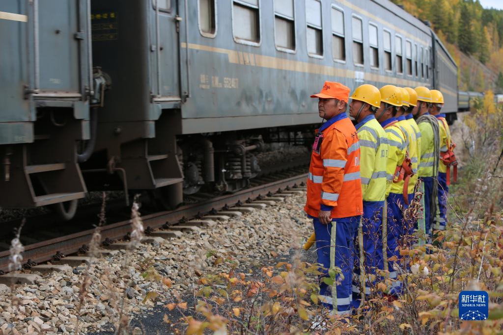 9月13日,中國鐵路哈爾濱局集團有限公司加格達奇工務段的鐵路工人在大興安嶺地區(qū)嫩林線等待火車通過。
